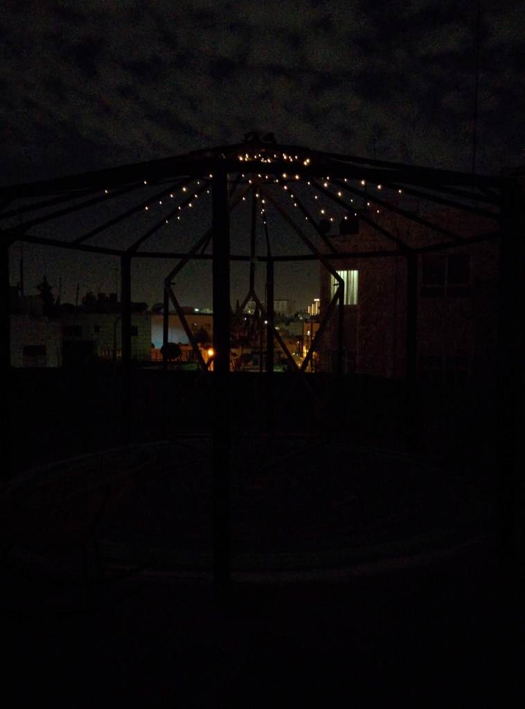 يتحوّلَ الحائطُ المعاكسُ لباب الشرفة إلى سينما أضواء ليلية، يقطع امتدادها إبريز الكهرباء. تبدو أضواء المدينة المُتلألئة في أفق الليل الساكت مثل حبلٍ رخيص من المصابيح الصغيرة المُعلّقة على حائط، تضيءُ وتنطفِىء، تُضيء وتنطفِىء