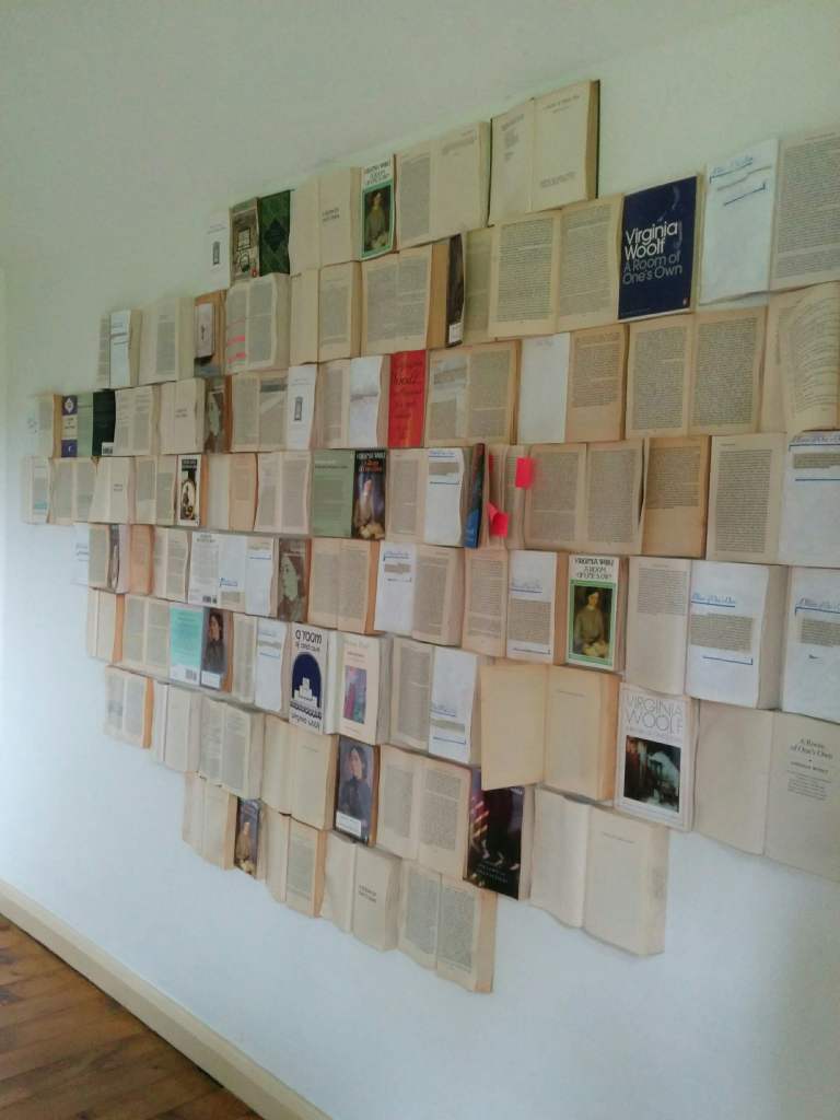 خرجت من البيت إلى الحديقة الخلفية، وتبعت الخطوات الحجرية فوق العشب لأصل إلى غرفة المكتب، حيث كانت فرجينيا تأخذ فنجان الشاي وتكتب. كنت أعلم أنّني في قمّة لحظاتي الميلودراميّة حين دخلت المكتب، ورأيت جدرانه تغطّيها صفحات متفرّقة اقتطعت من رواياتها. لا أتخيّل أن وولف كانت لتتحمّل هذا الديكور المبتذل، ولا أنّ شابّة غريبة مثلي واقفة تبكي بسذاجة في غرفة مكتبها