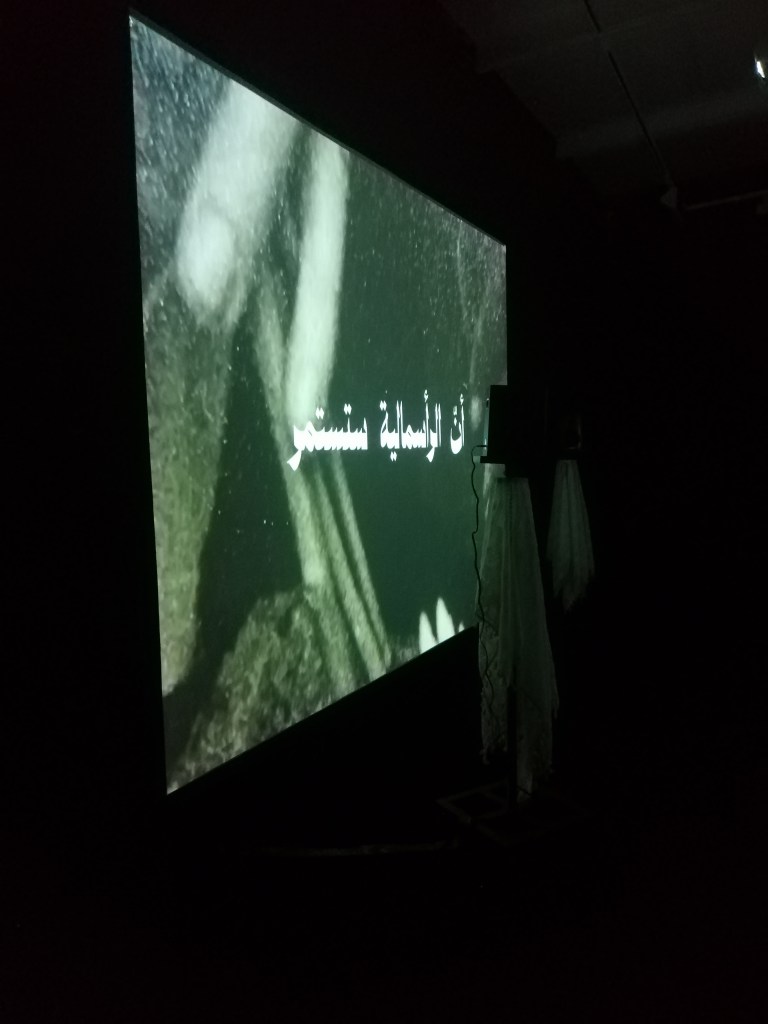 في غرفة العرض المجاورة للمشروع الفنّي يُعرَض تركيب بصري صوتي لزارا جوليوس، أدخل